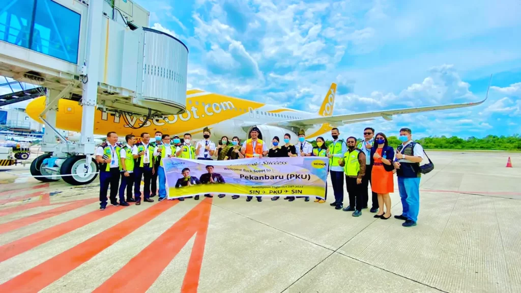 Riaumag.com , Pekanbaru —–Bandara Sultan Syarif Kasim (SSK) II Pekanbaru kembali menambah layanan rute penerbangan Internasional untuk tujuan Singapura, seiring dengan dioperasikannya kembali penerbangan langsung dari Singapura – Pekanbaru PP oleh maskapai Fly Scoot Airlines, Senin (24/10/2022).