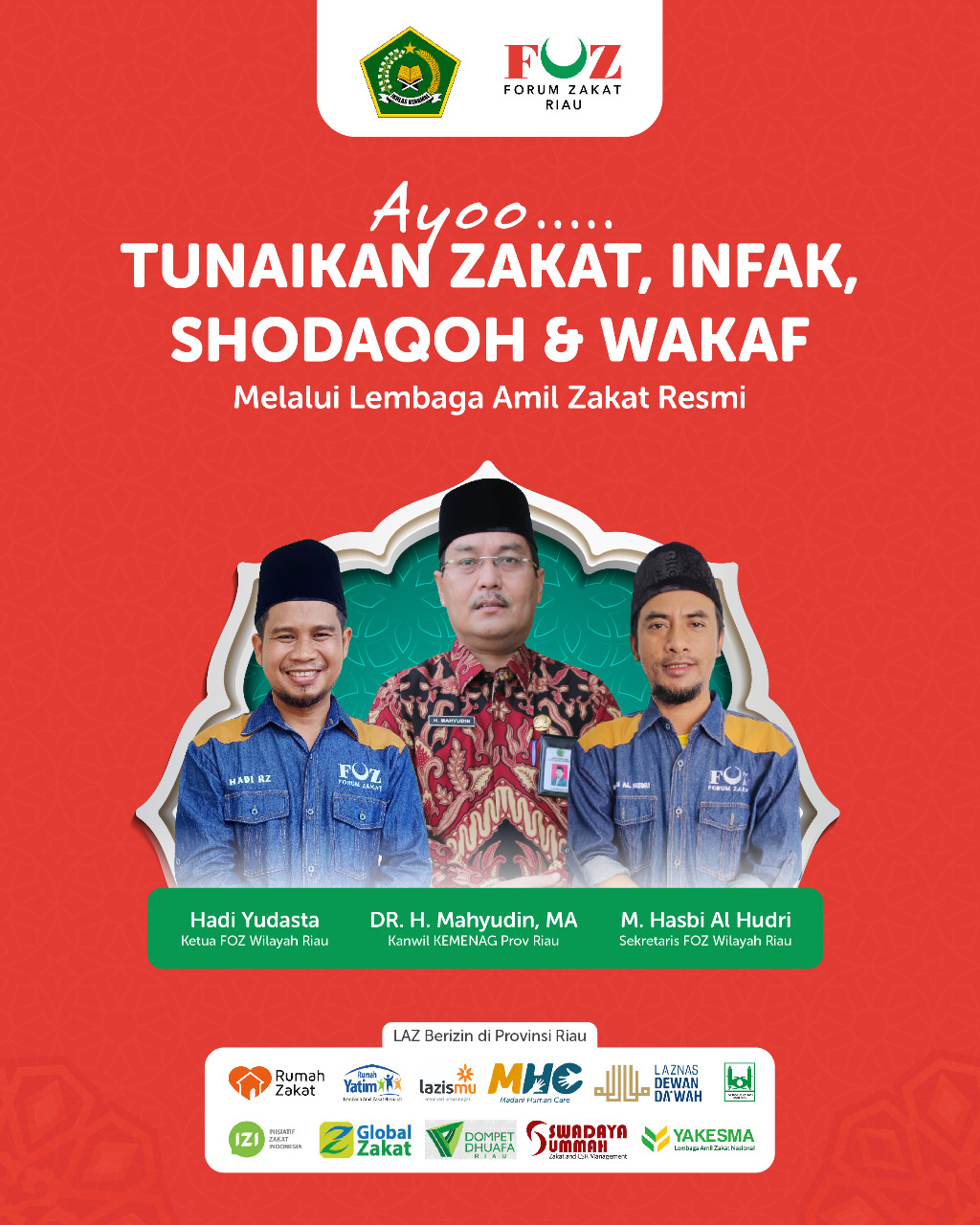 tampak di foto Kanwil KEMENAG Provinsi Riau DR. H. Mahyudin, MA beserta Ketua FOZ Wilayah Riau, Hadi Yudasta dan Sekertaris FOZ Wilayah Riau, M. Hasbi Al Hudri menghimbau kepada Masyarakat yang hendak menunaikan Zakat, Infaq, Shodaqoh, dan Wakaf tunaikan-lah ke Lembaga Zakat Resmi yang telah di berikan izin oleh Pemerintah.