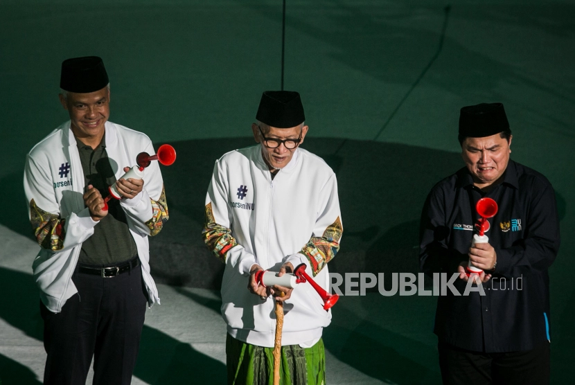 Menteri BUMN Erick Thohir (kanan), Rais Aam PBNU Kiai Miftachul Akhyar (tengah), dan Gubernur Jawa Tengah Ganjar Pranowo (kiri) membunyikan terompet saat pembukaan Porseni NU di GOR Sritex Arena, Solo, Jawa Tengah, Senin (16/1/2023). Porseni Nahdlatul Ulama (NU) diikut 3.600 peserta kategori pelajar, mahasiswa, dan santri pondok pesantren dari 34 Provinsi di Indonesia tersebut akan mempertandingankan tujuh cabang olahraga dan kesenian NU yang berlangsung hingga tanggal 22 Januari 2023.ANTARA/MOHAMMAD AYUDHA