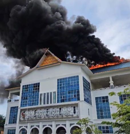 Kobaran api dan kepulan asap hitam tebal tampak jelas di atap Gedung Lipat Kajang tersebut. Apa tapi dengan jelas menyala di atas atap gedung.
