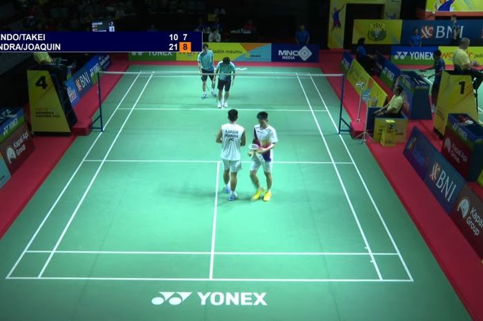 Hanya dalam 27 menit saja, Raymond/Joaquin mampu menumbangkan wakil Jepang tersebut dalam dua gim.
