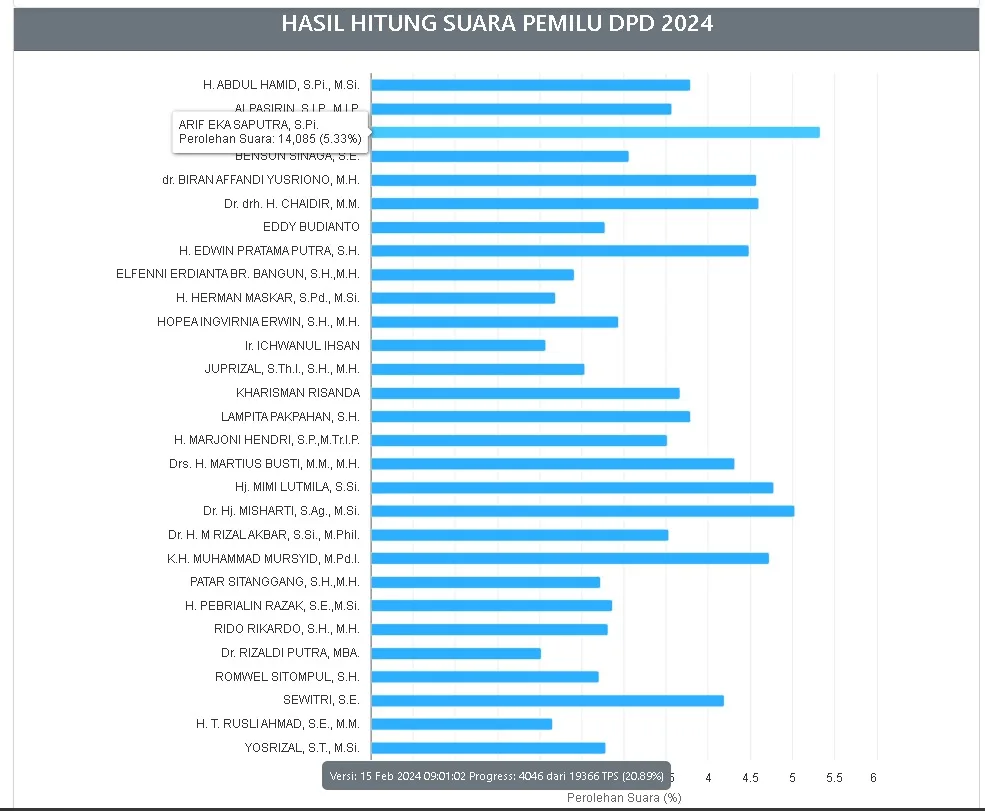 Meski begitu hasil hitung suara sudah bisa akse di lama kpu.go.id.Sementara untuk hitung suara dari pemilihan Dewan Perwakilan Daerah (DPD) untuk wilayah Riau, saat ini calon Arif Eka Saputra berada dipuncak dengan perolehan suara sebanyak 18.786 atau setara dengan 5.91 persen.