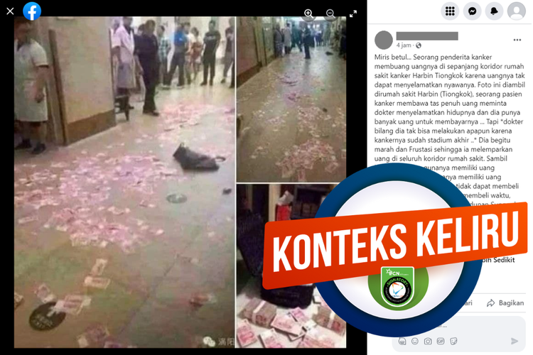 Foto dengan narasi soal pasien kanker membuang uang di RS Harbin China karena marah dan frustrasi disebarkan oleh akun Facebook ini, ini, ini, dan ini.