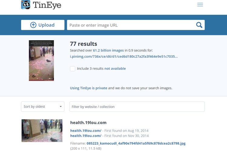 Dengan bantuan penelusur gambar yang dikembangkan TinEye, diketahui foto tersebut telah beredar di media sosial setidaknya sejak 2014.