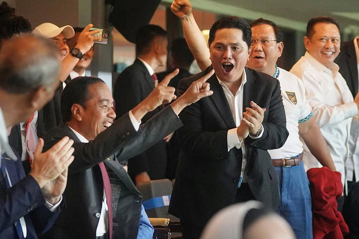 Presiden Jokowi bersama Ketua Umum PSSI Erick Thohir, Menhan Prabowo Subianto, menyaksikan pertandingan babak penyisihan Grup A Piala Dunia U-17 2023 di Stadion Gelora Bung Tomo, Surabaya, Jawa Timur, Jumat (10/11/2023). Foto: Dhemas Reviyanto/ANTARA FOTO