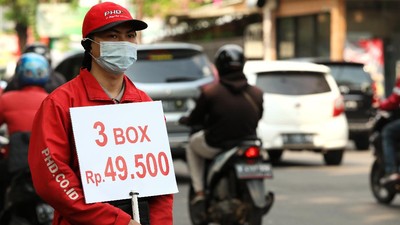 Foto: Karyawan PHD berjualam pizza di pinggir jalan di Kawasan Bintaro, Tangerang Selatam, Jumat (18/9/2020). (CNBC Indonesia/Andrean Kristianto))