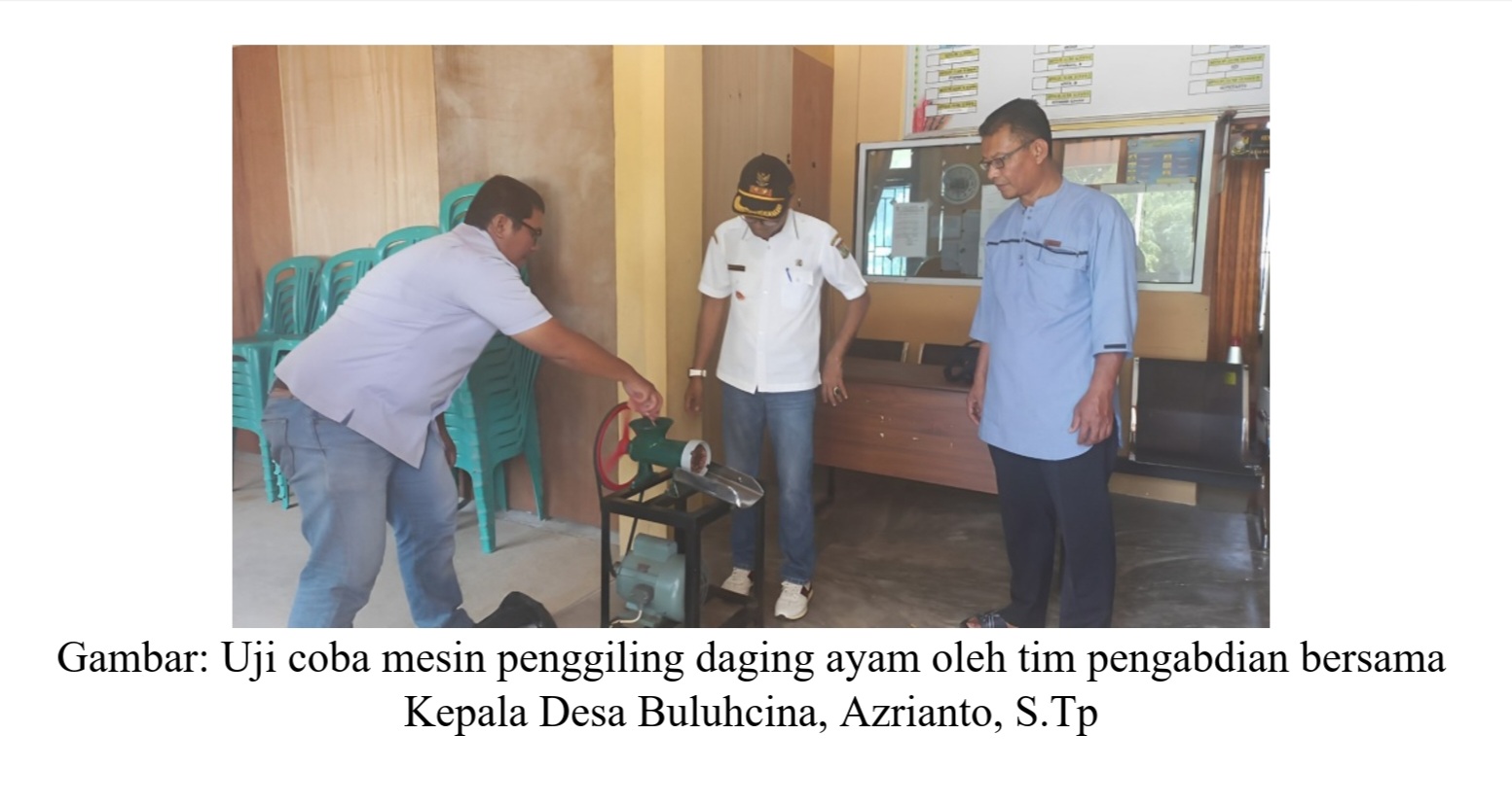 Gambar: Uji coba mesin penggiling daging ayam oleh tim pengabdian bersama