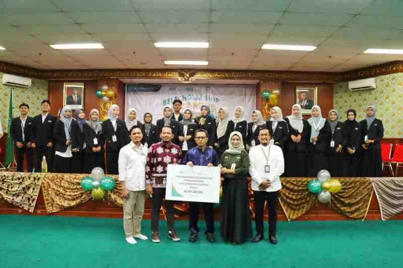 Penyerahan beasiswa secara simbolis dilakukan oleh Area Manager PT Bank Syariah Indonesia Tbk (BSI) Area Pekanbaru, Tengku Rizaldi Syahputra, kepada Rektor UIN Suska Riau, Prof Dr H Hairunnas M Ag.